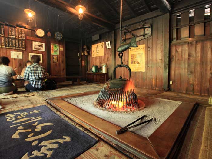 当初からの囲炉裏が現役で活躍していて、名物は岩魚の塩焼きです。